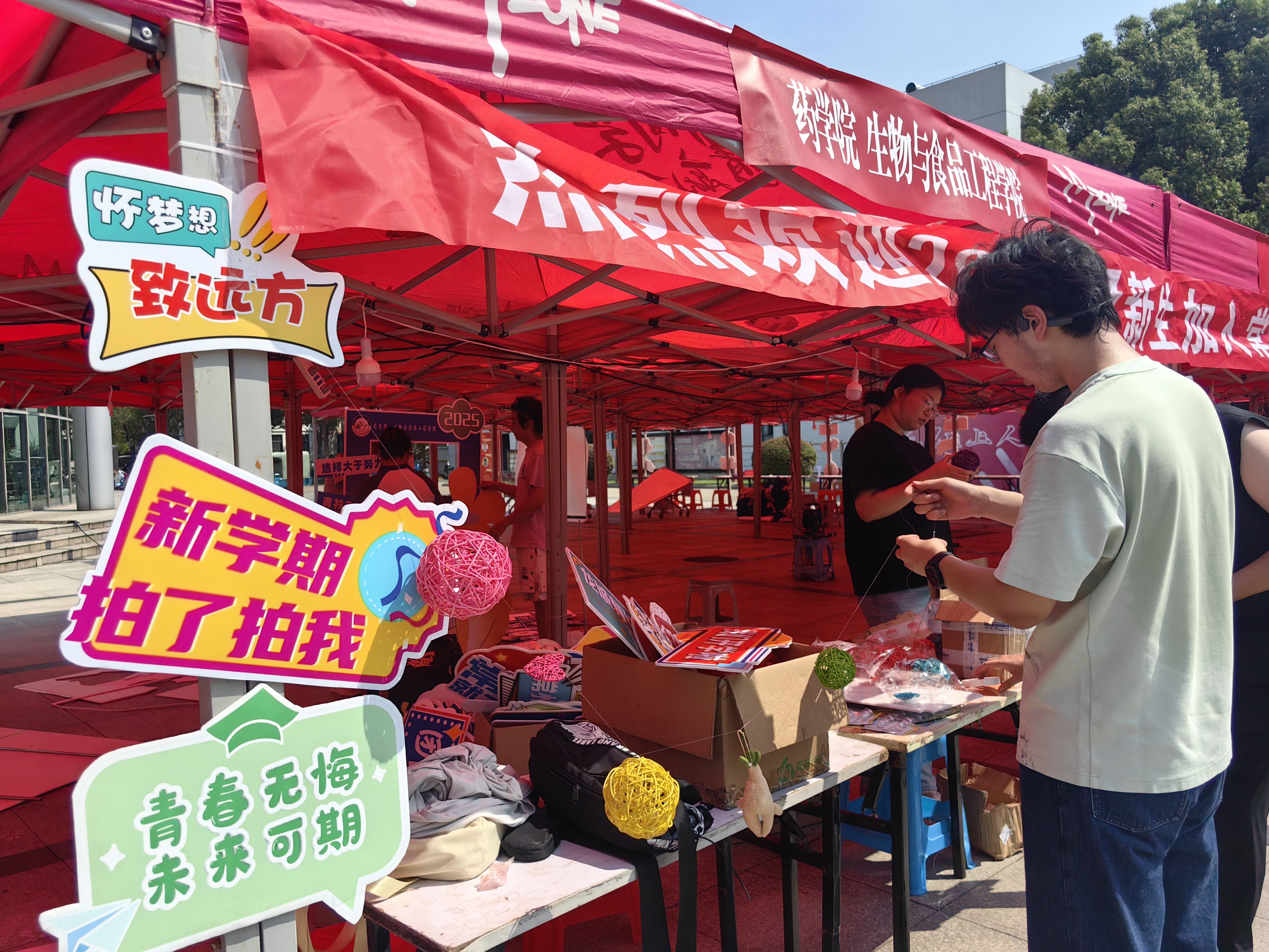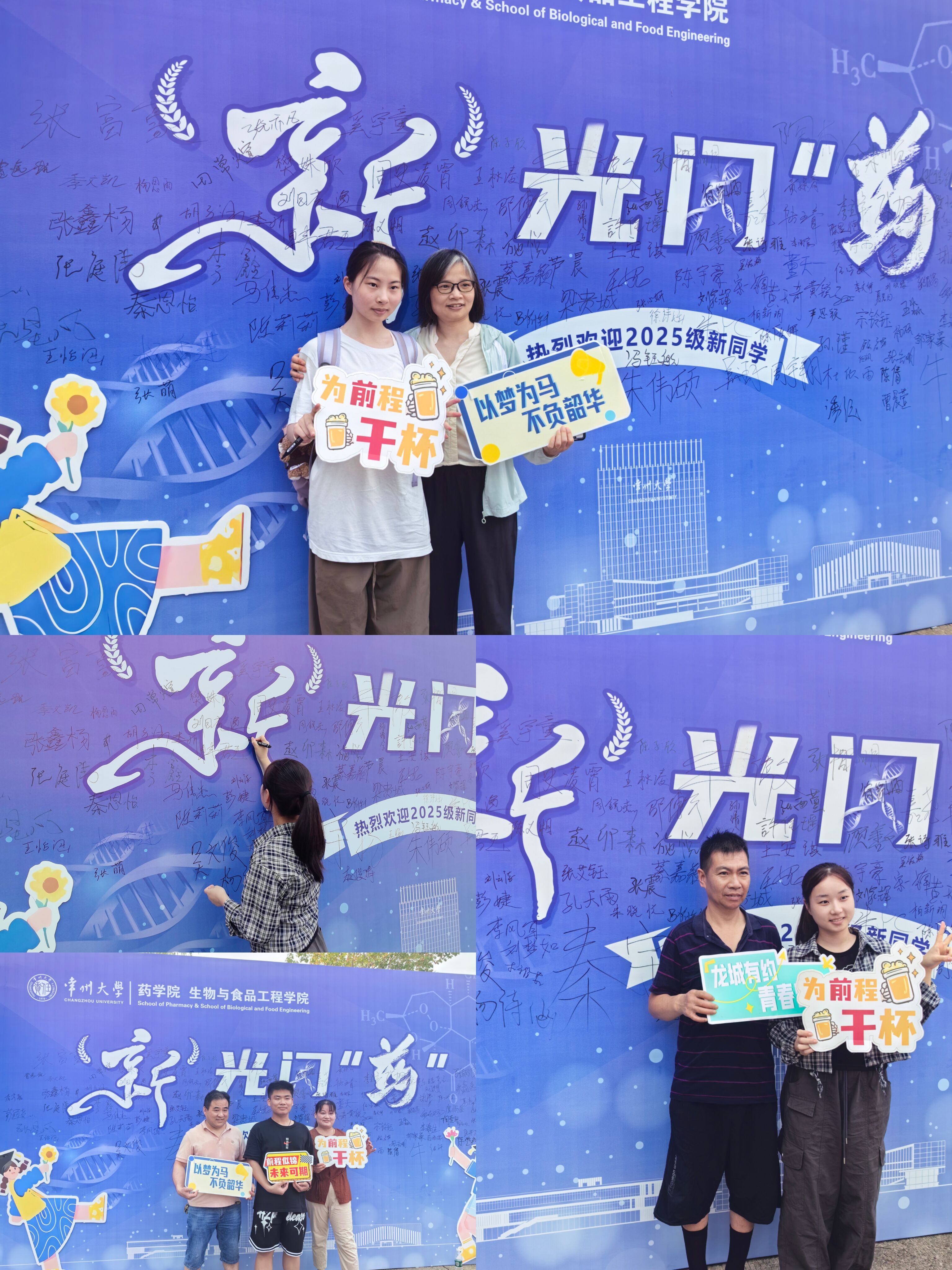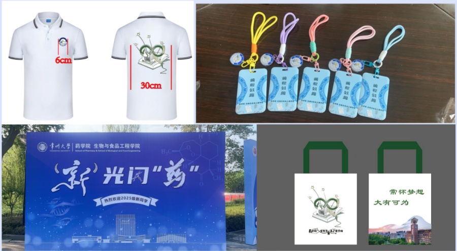 在迎新现场,志愿者们用各种标牌表达对新生的欢迎与祝福,并设置了精心设计的包含学院四个专业的签名墙,以麦穗代表食品,用试管代表制药专业,用青蒿素的分子式为药学专业代言,用经典的DNA双螺旋代表生物工程,将这些元素和“新光闪药”的主题融在一起,配合学校的建筑线条,以蓝色为背景,展示了学院特色。现场还布置了中药玩偶和展示柜,果汁、奶片、葡萄酒、酵素等丰富多样的产学研成果充分体现了学院的专业特色。