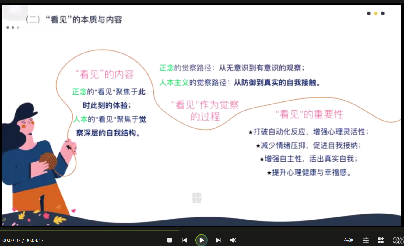 在正念疗法(Mindfulness)和人本主义心理学中,“看见”意味着不带评判地观察自己的情绪、想法和行为模式。“看见”在心理学中被称为“觉察”,是打破自动化反应、开启改变的第一步。“看见”的内容很丰富,可以是未被处理的情绪、限制性信念、童年形成的防御机制,甚至是内在的渴望与潜能。