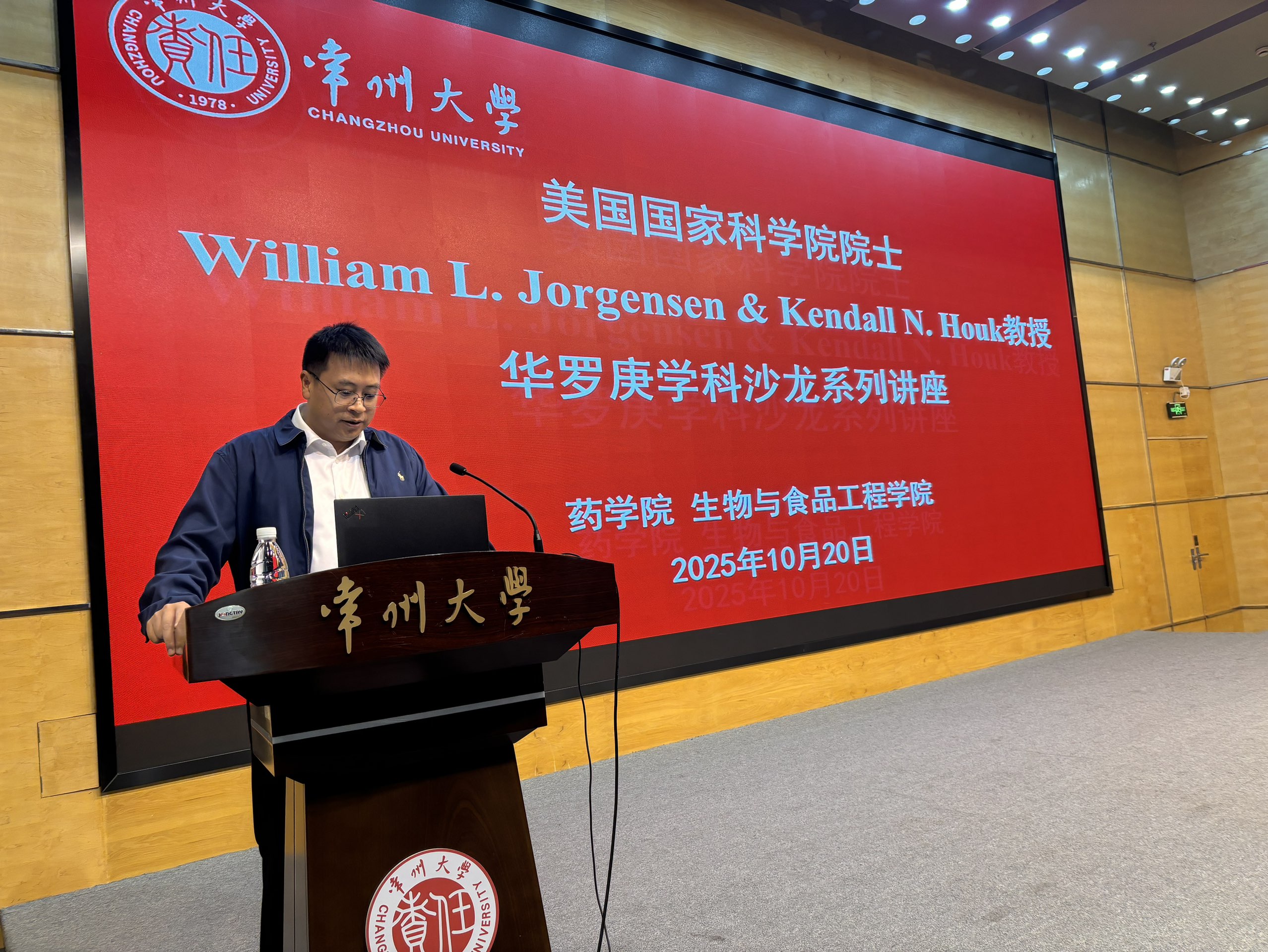 2025年10月20日上午10点,美国国家科学院院士、美国加州大学洛杉矶分校教授、中国科学院外籍院士Kendall N. Houk应邀参加常州大学药学院“华罗庚学科沙龙”活动,在文彰楼报告厅作题为“周环选择性及周环反应酶(Periselectivity and Pericyclases)”的学术报告。报告会由副校长李亚飞和中国科学院院士吴云东共同主持。