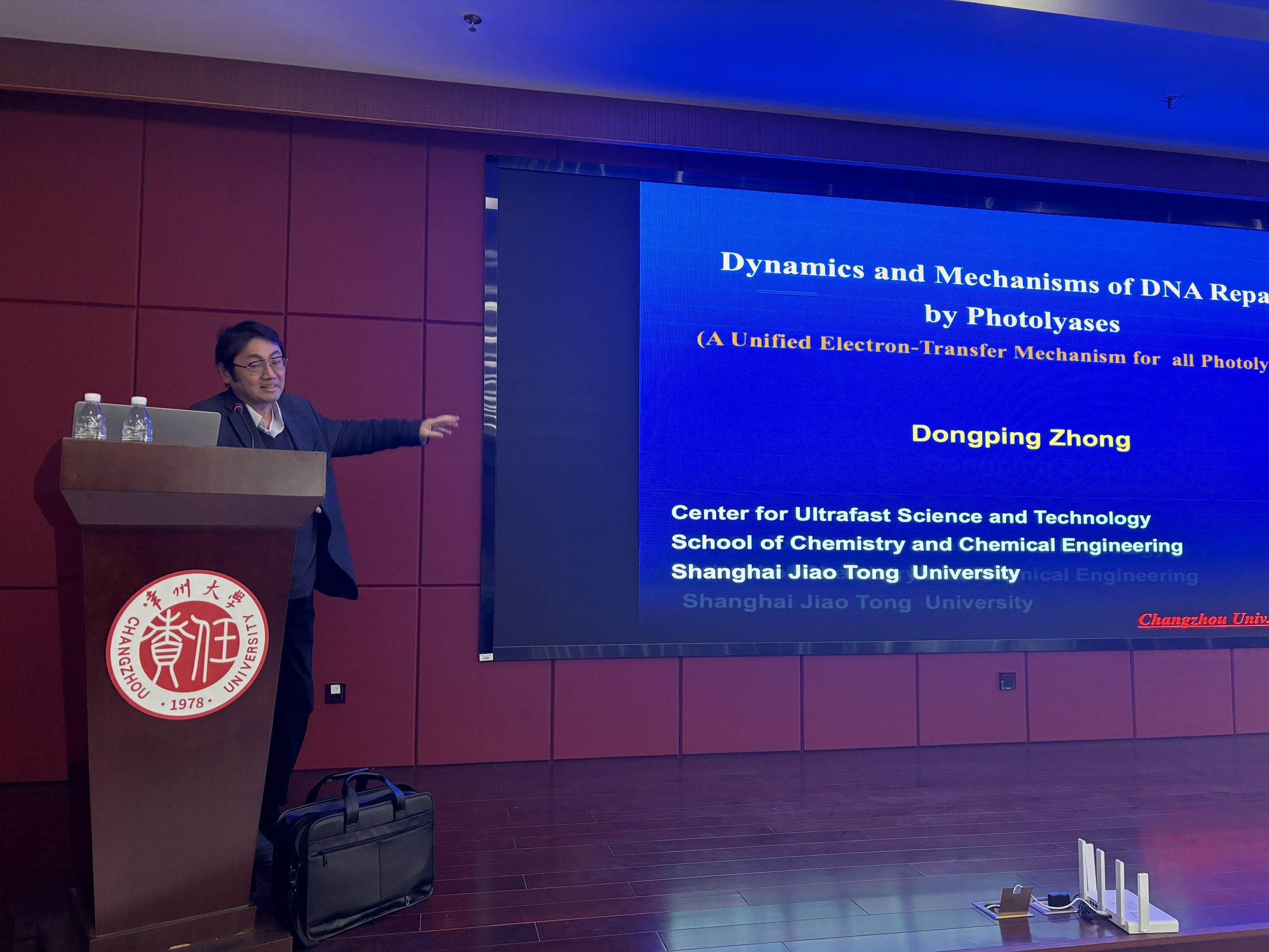 2026年3月11日,上海交通大学仲冬平教授应邀参加常州大学药学院生物与食品工程学院“华罗庚学科沙龙”活动,为我院师生作了题为“光裂合酶修复DNA的动力学与机制”的专题学术报告。报告由药学院蔡志强院长主持,学院相关师生代表参加了报告会。