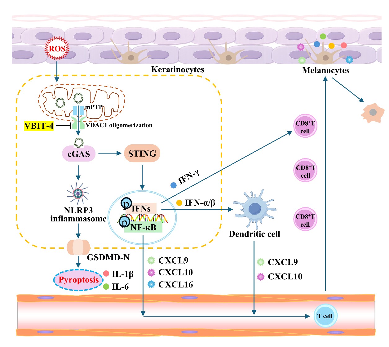 白癜风的发生发展涉及多种皮肤细胞类型的协同作用,其中以黑色素细胞、角质形成细胞和真皮成纤维细胞为关键调控单元。然而,不同细胞在疾病中的作用既存在共性机制,也具有各自特异功能,其内在联系长期缺乏系统性阐释。围绕这一科学问题,研究团队以氧化应激为切入点,聚焦线粒体功能异常介导的炎症反应,在不同细胞类型中开展了系统研究。其中,发表于《Cell Death & Disease》的论文 “Mitochondrial DNA release via VDAC1 in keratinocytes: a key driver of innate immunity and vitiligo pathogenesis” 以角质形成细胞为研究对象,揭示其在氧化应激条件下通过释放mtDNA启动免疫反应,在疾病早期炎症激活中发挥重要作用。发表于《Free Radical Biology and Medicine》的论文 “VDAC1 oligomerization-mediated mtDNA release under sublethal oxidative stress: a novel inflammatory mechanism in vitiligo” 从分子机制层面深入解析了VDAC1寡聚化在调控mtDNA释放过程中的关键作用,为理解炎症信号放大的调控基础提供了重要依据。此外,团队在《International Immunopharmacology》发表的论文“Targeting VDAC1-dependent mtDNA release attenuates fibroblast innate immune activation and vitiligo pathogenesis”进一步在真皮成纤维细胞中验证了该通路的普遍性,并通过药理学干预表明,靶向该通路可有效抑制炎症反应并改善细胞功能状态。