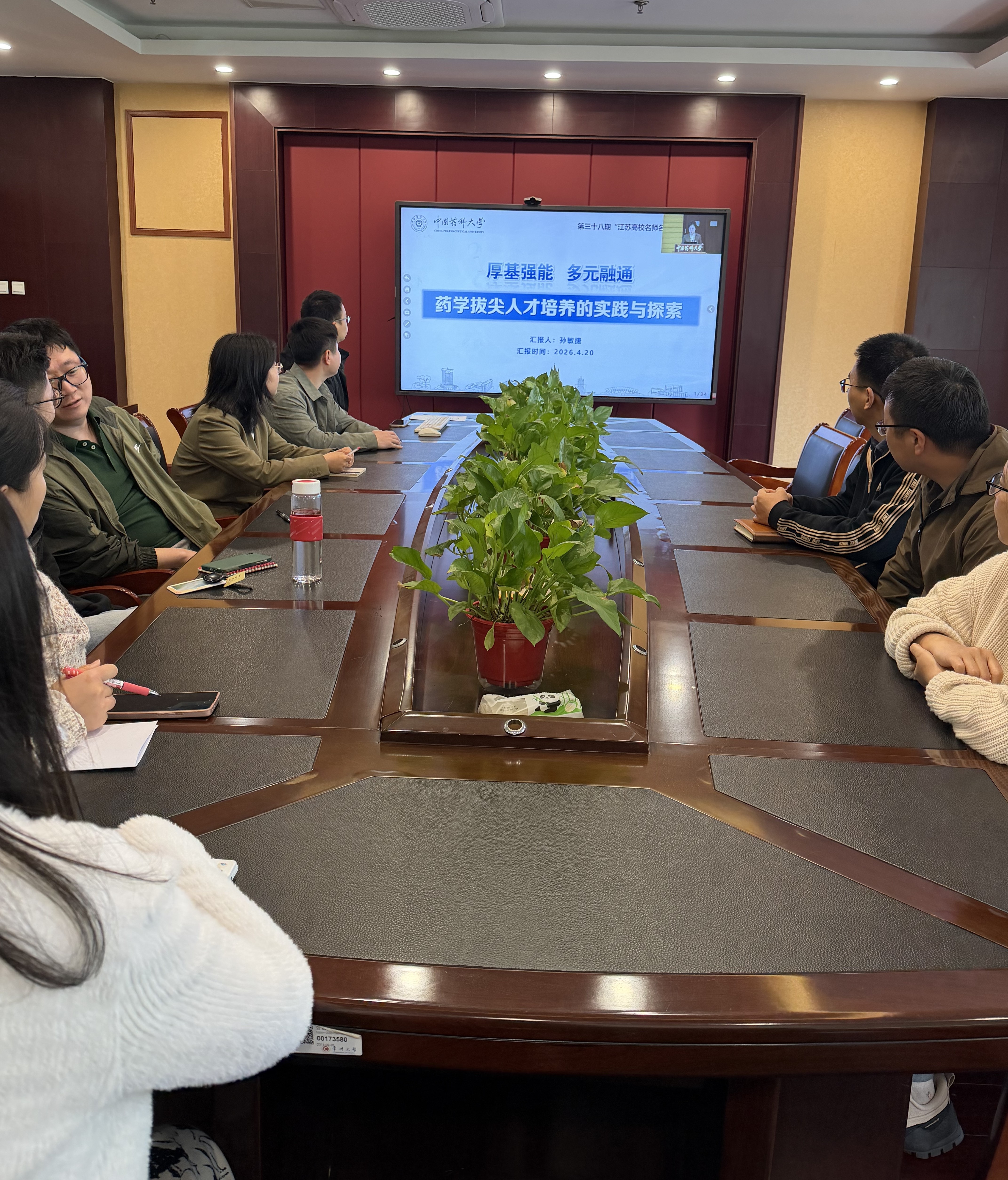 为深入贯彻落实《省教育厅关于加强高校基层教学组织建设促进教学能力提升的指导意见》要求,促进高校教师教学交流与资源共享,教务处、教师发展中心联合药学院于2026年4月20日下午,在药学院A204会议室共同组织观看了由江苏高校教师教学发展研究会主办的第三十八期“江苏高校名师名课月月观摩”活动现场直播,本次活动主题为“守正创新育英才,精药强基筑一流——药学拔尖创新人才培养的实践与探索”,由教育部药学“101计划”核心课程及教材工作组组长、国家重大人才工程特聘教授孙敏捷主持。药学院相关负责人、骨干教师及青年教师代表共同在线观摩学习。